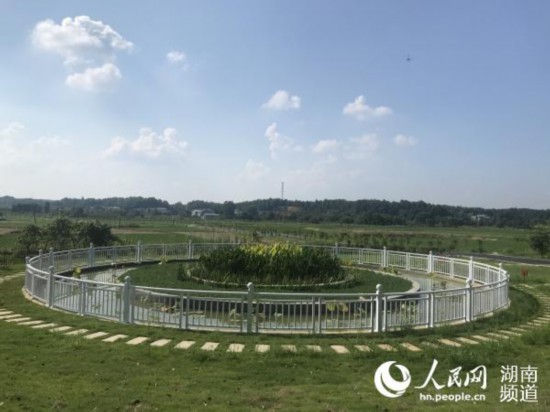炎炎夏日,宁乡市陈家桥村池塘边的知了叫个不停;池塘里,金鱼正欢快地穿梭于郁郁葱葱的绿植中。池塘最外层种满了亭亭玉立的荷花,中间是茂密的狐尾藻,最里层则是水芭蕉。