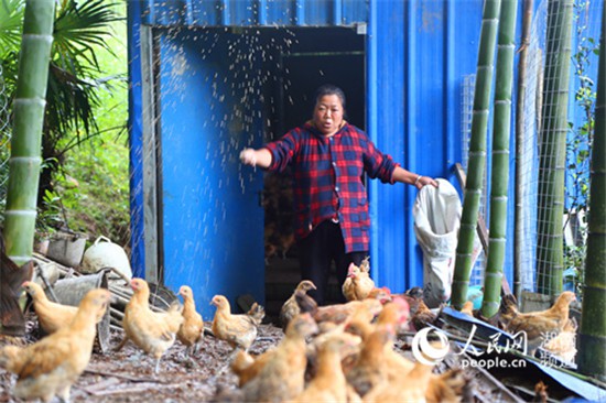 谢仕梅大姐在家门口养鸡。何萌 摄